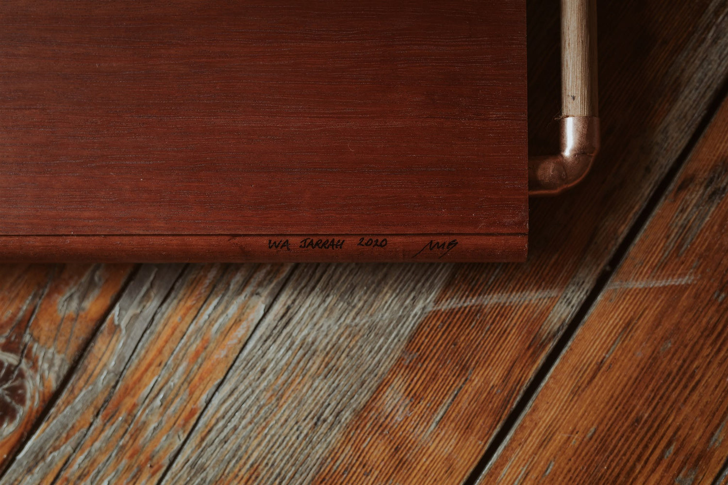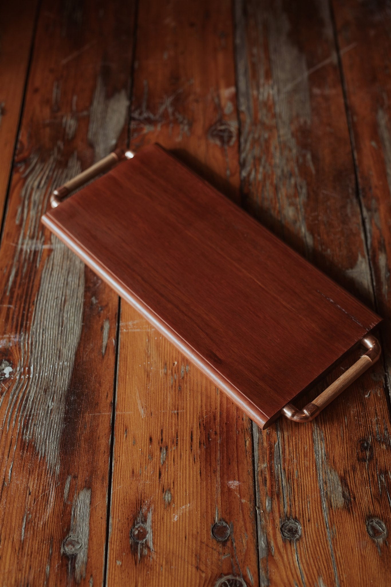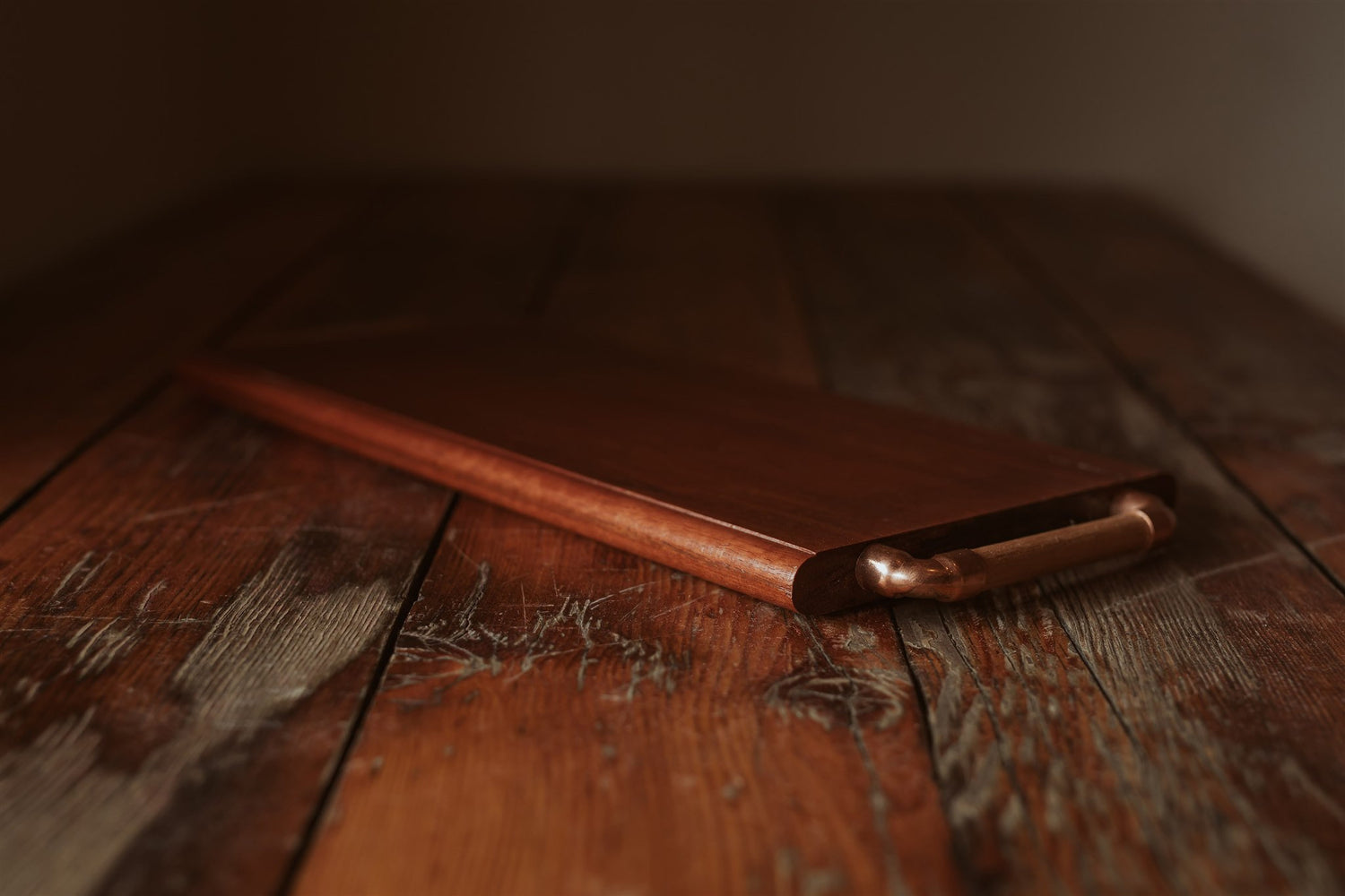 I've designed these cutting and presentation boards from a stunning dark red batch of premium grade WA Jarrah. With Alpine Ash handles anchored in place with copper studs and elbows, these boards are edge-routed, sanded to 600 grade and sealed with two coats of food-safe polyurethane. These Jarrah boards are 370mm in length and 185mm across; and work well with one side kept as a day-to-day preparation board, then flipping over to use as a cheese and fruit presentation board.