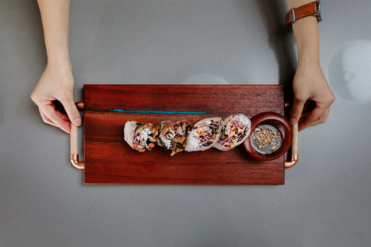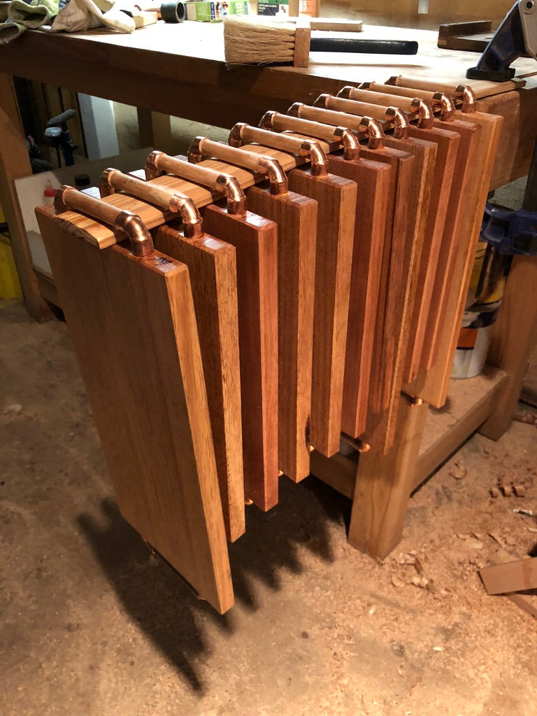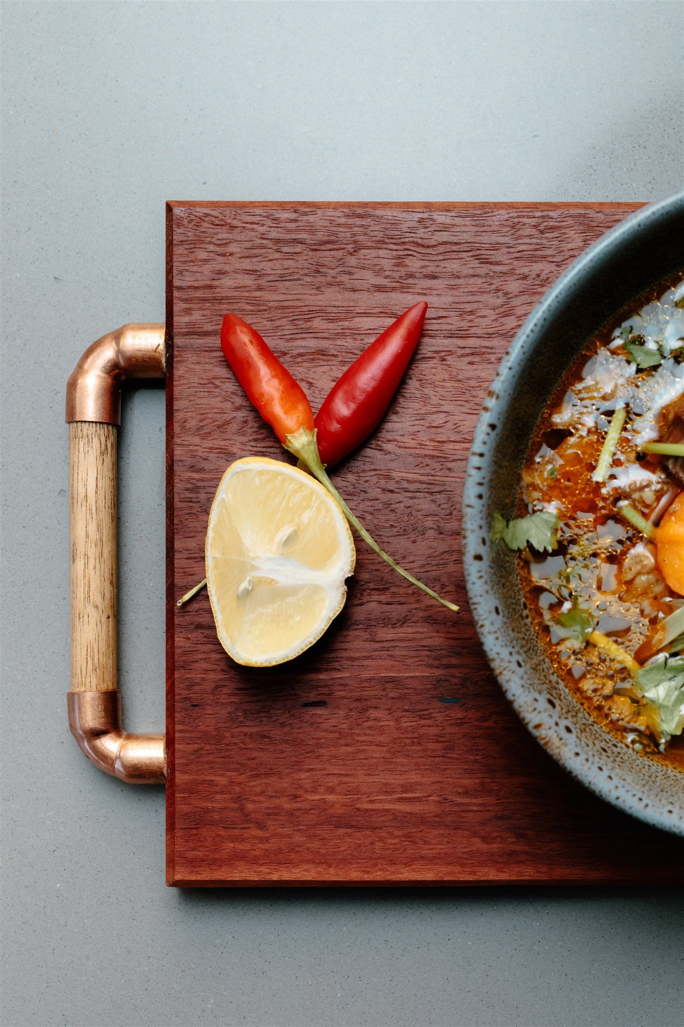 I've designed these cutting and presentation boards from a stunning dark red batch of premium grade WA Jarrah. With Alpine Ash handles anchored in place with copper studs and elbows, these boards are edge-routed, sanded to 600 grade and sealed with two coats of food-safe polyurethane. These Jarrah boards are 370mm in length and 185mm across; and work well with one side kept as a day-to-day preparation board, then flipping over to use as a cheese and fruit presentation board.
