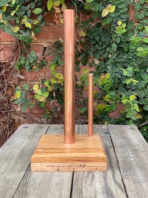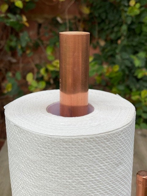 Paper towels can become a table feature with these copper and timber towel holders. They are around 340mm high and wide enough to suit most common commercial paper towel rolls. The square bases are 135mm wide and are made up of two pieces of beautiful recycled Victorian Alpine Ash. Square versions come with a copper towel keeper.