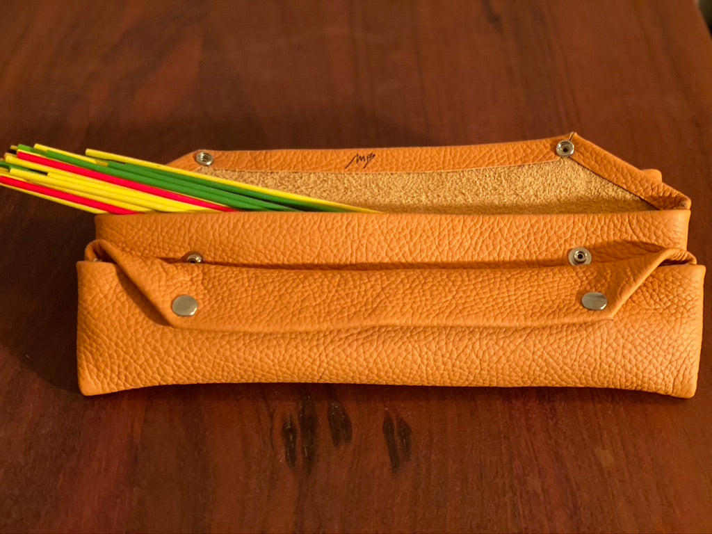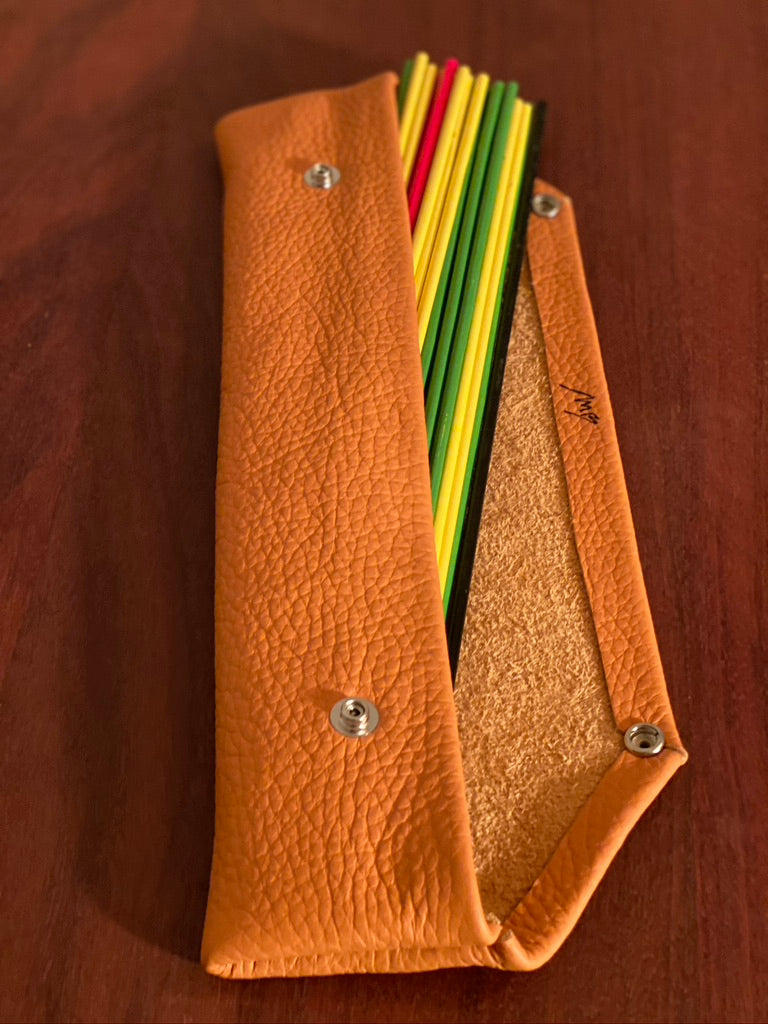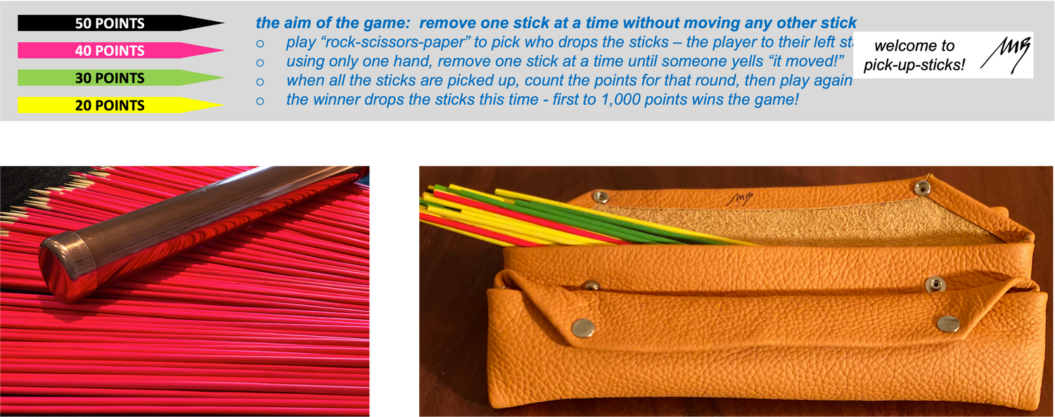 I make two versions, each based on the standard 48 stick set - this version comes in a deluxe hand-stitched Italian leather case, complete with game instructions. Measuring 33 cm by 7 cm, it houses a standard 48 stick set snugly. It also comes as a double set option with 96 sticks for those bigger games!