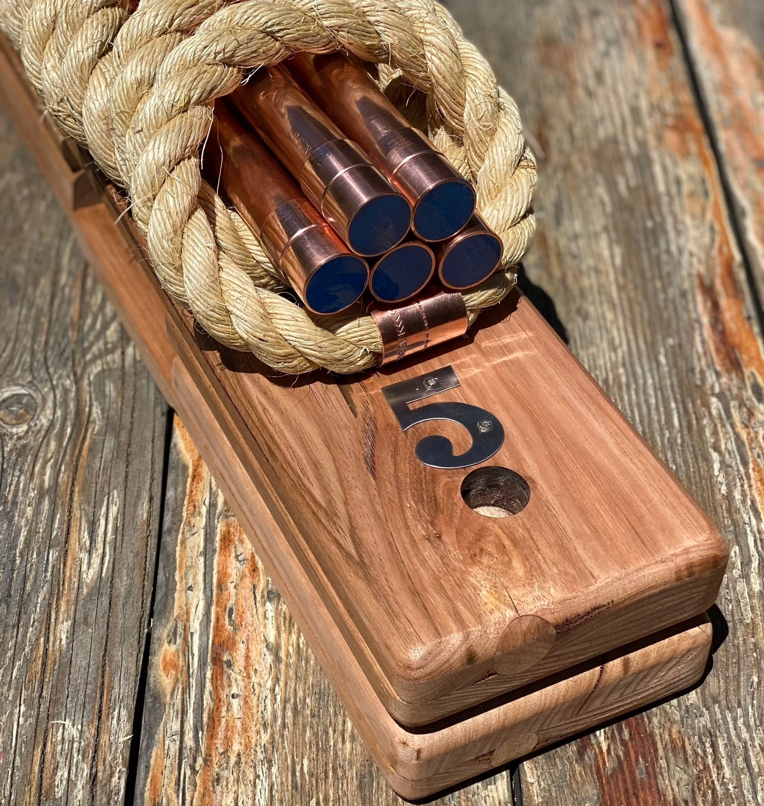 Weighing in at around 8kgs (just under 18lbs) these sets are intended to become family heirlooms and last a lifetime - the 1" copper target poles are topped with beautiful metallic coloured resin-caps, are each given a score of either 5, 10, 15, 20 or 50 points. To make this a lasting set, I only use screw-on solid brass numbers. The set comes with a carry bag and is designed to come apart for easy storage or travelling.