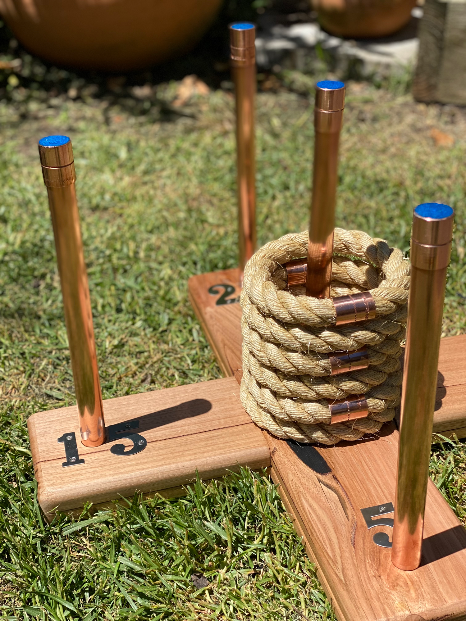 Each of my quoits sets comes with 6 hand-made sisal rope and copper collared quoits - these are hand made from heavy duty 1" sisal rope, which is sealed and then joined with a heavy copper collar, to give them a nice solid throwing weight.