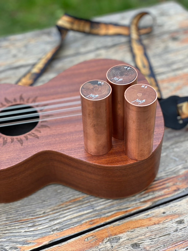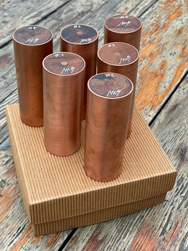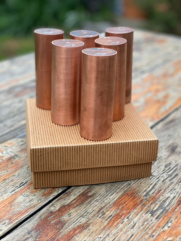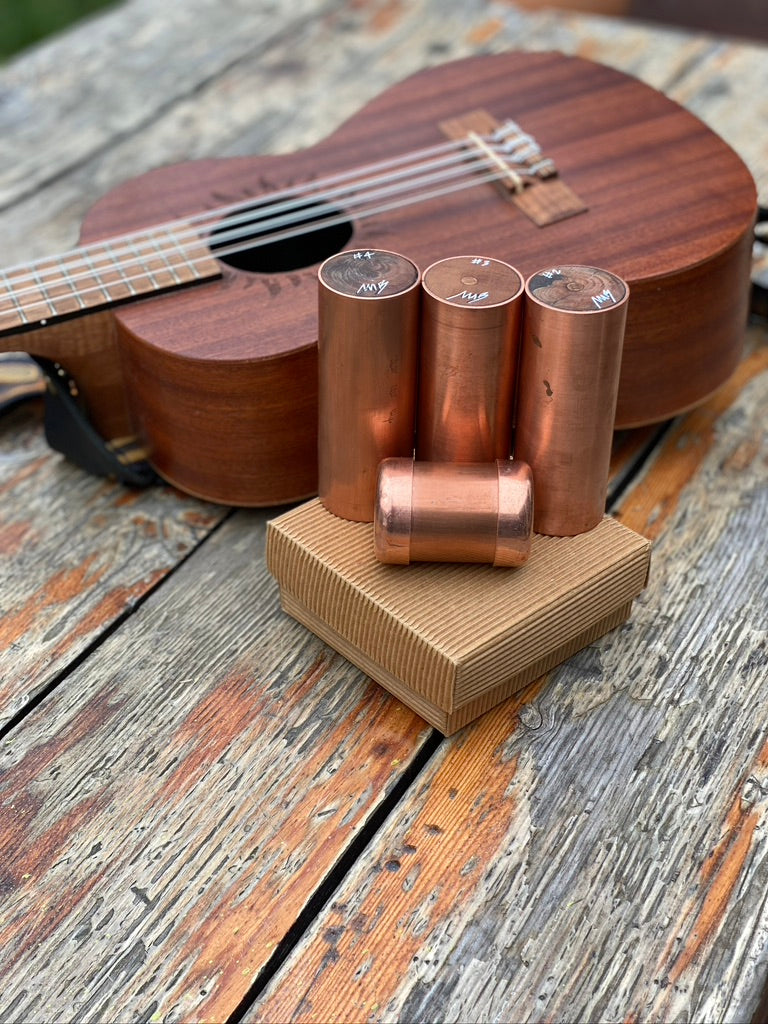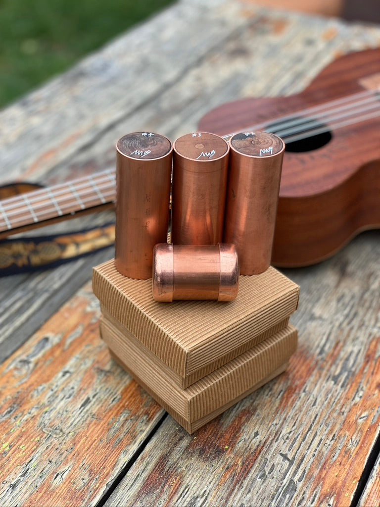 After breaking too many commercial rhythm shakers in the heat of the moment on stage, I started designing my own - this is the result! These are hand-made from 38mm copper cylinders, finished with Australian native timbers - usually Red Gum, Ironbark or Coastal Tea Tree caps.