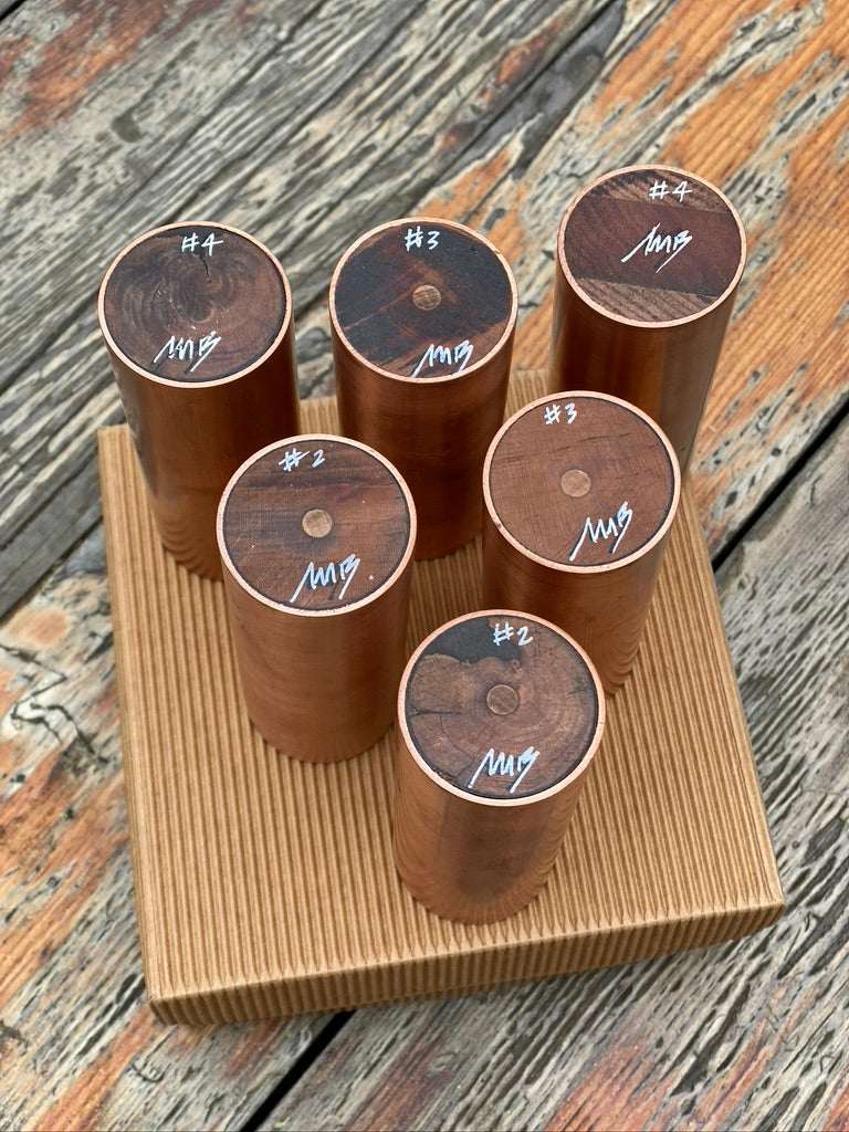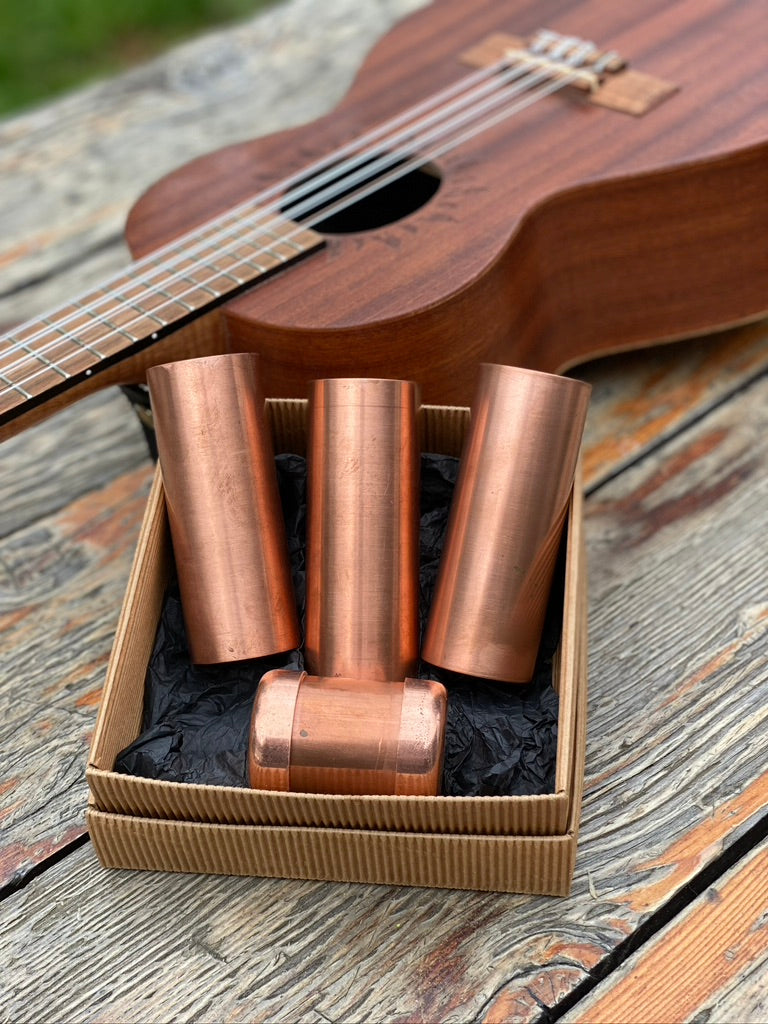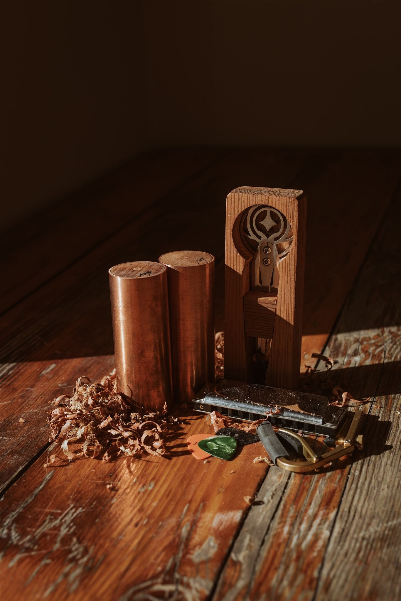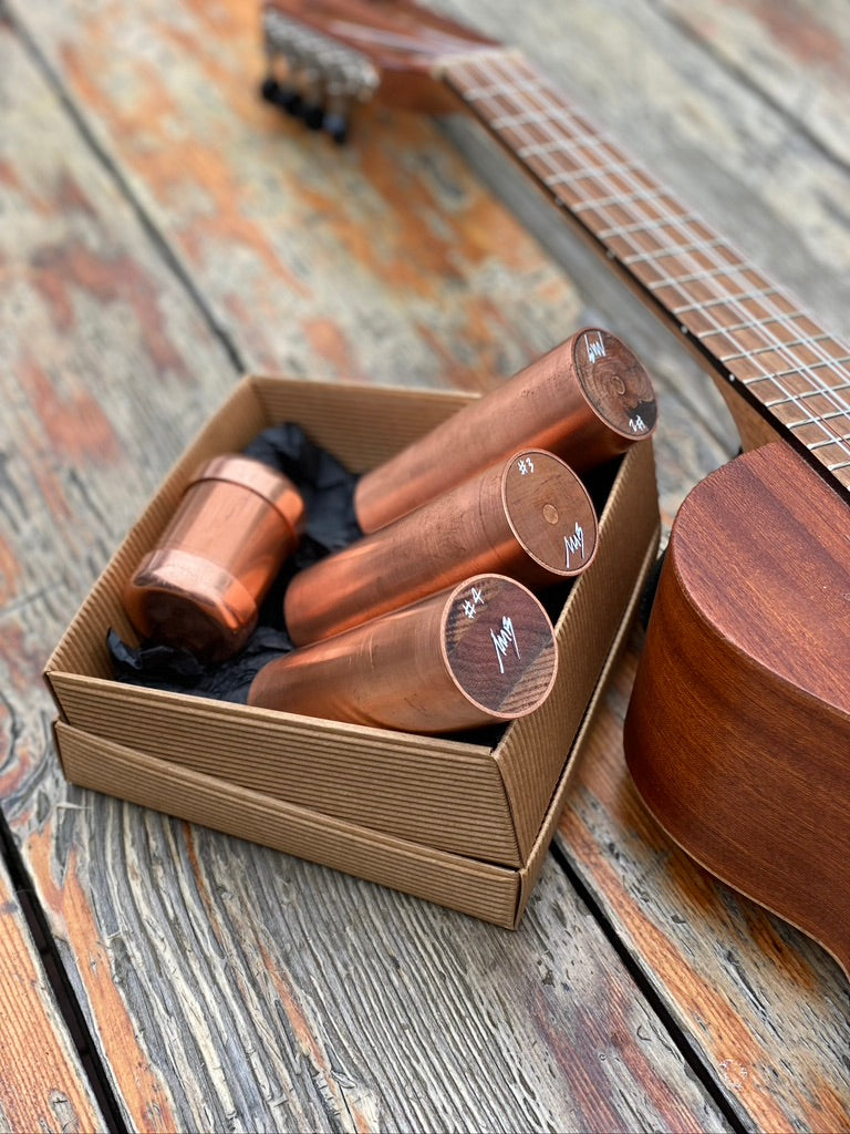 After breaking too many commercial rhythm shakers in the heat of the moment on stage, I started designing my own - this is the result! These are hand-made from 38mm copper cylinders, finished with Australian native timbers - usually Red Gum, Ironbark or Coastal Tea Tree caps.