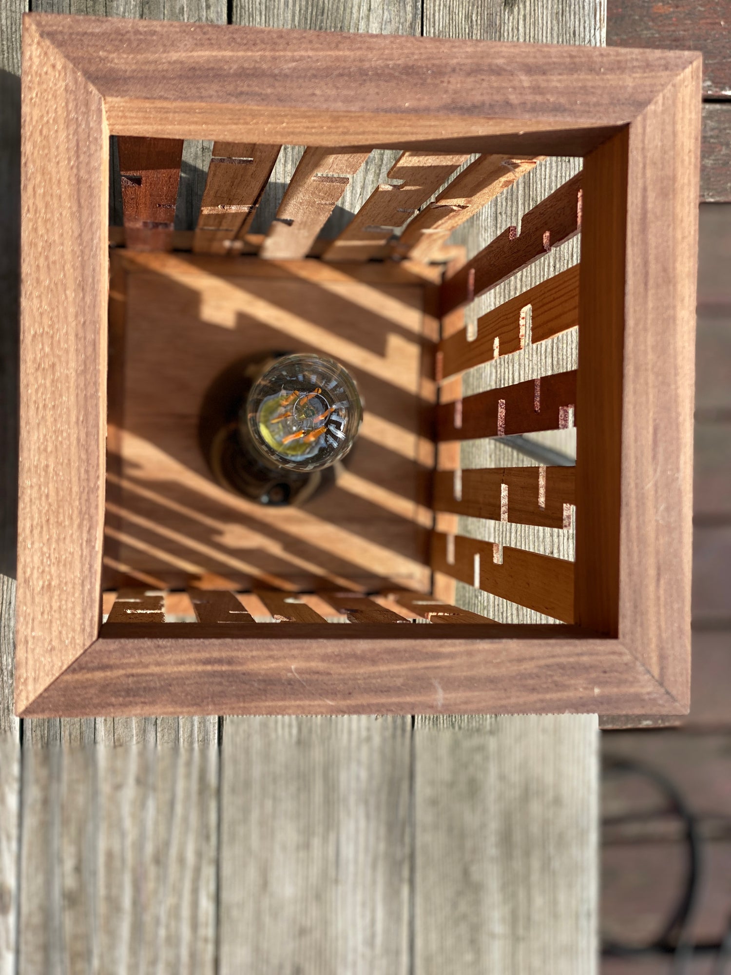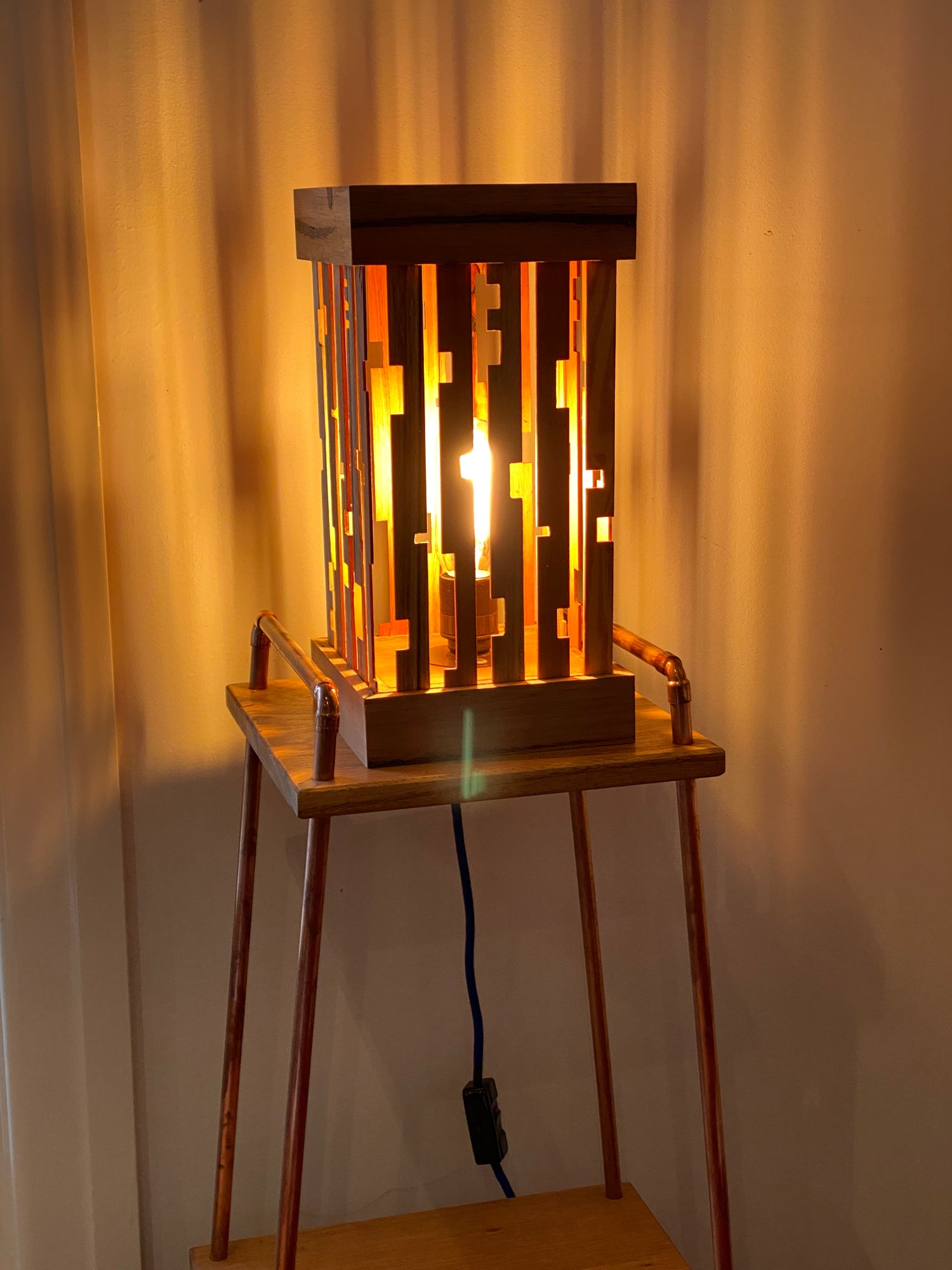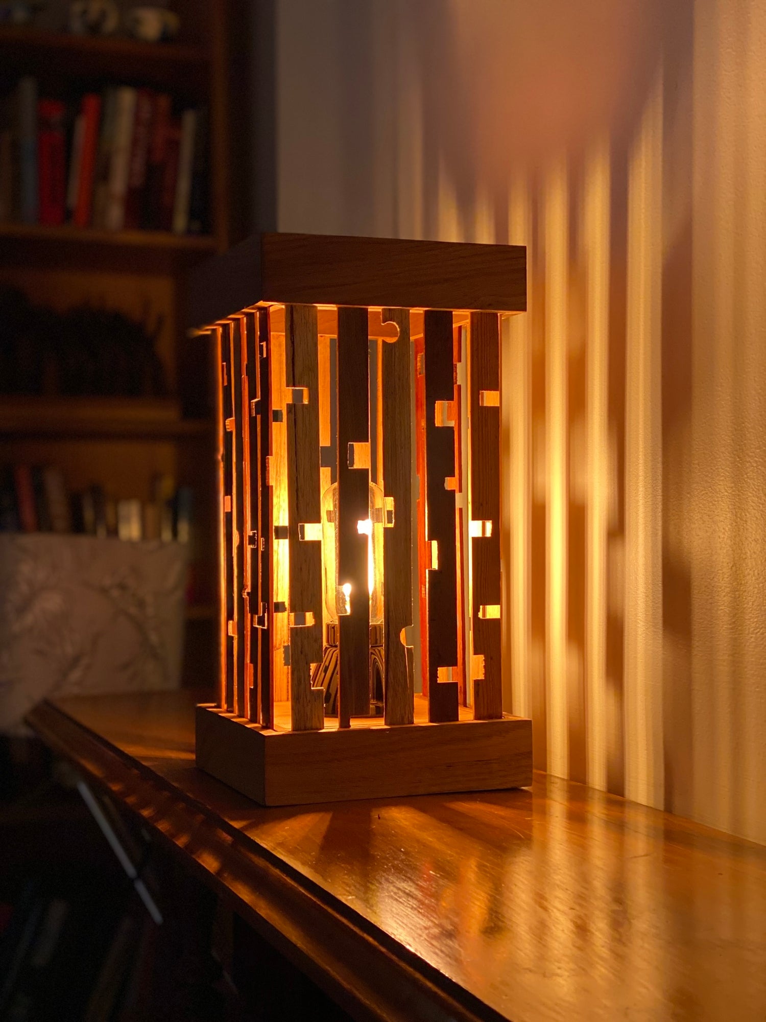 My shadow lamps are made to order and create a very special mood: they're painstakingly assembled from very slim pieces of contrasting coloured native timbers with unusual cutout shapes.
