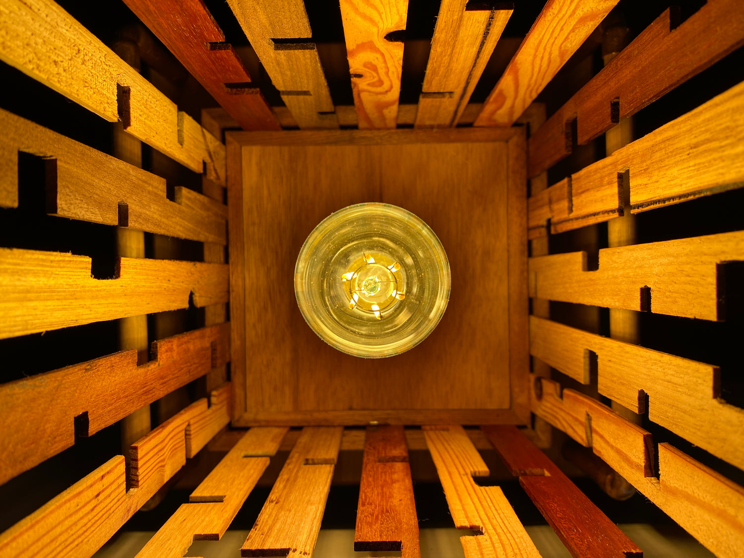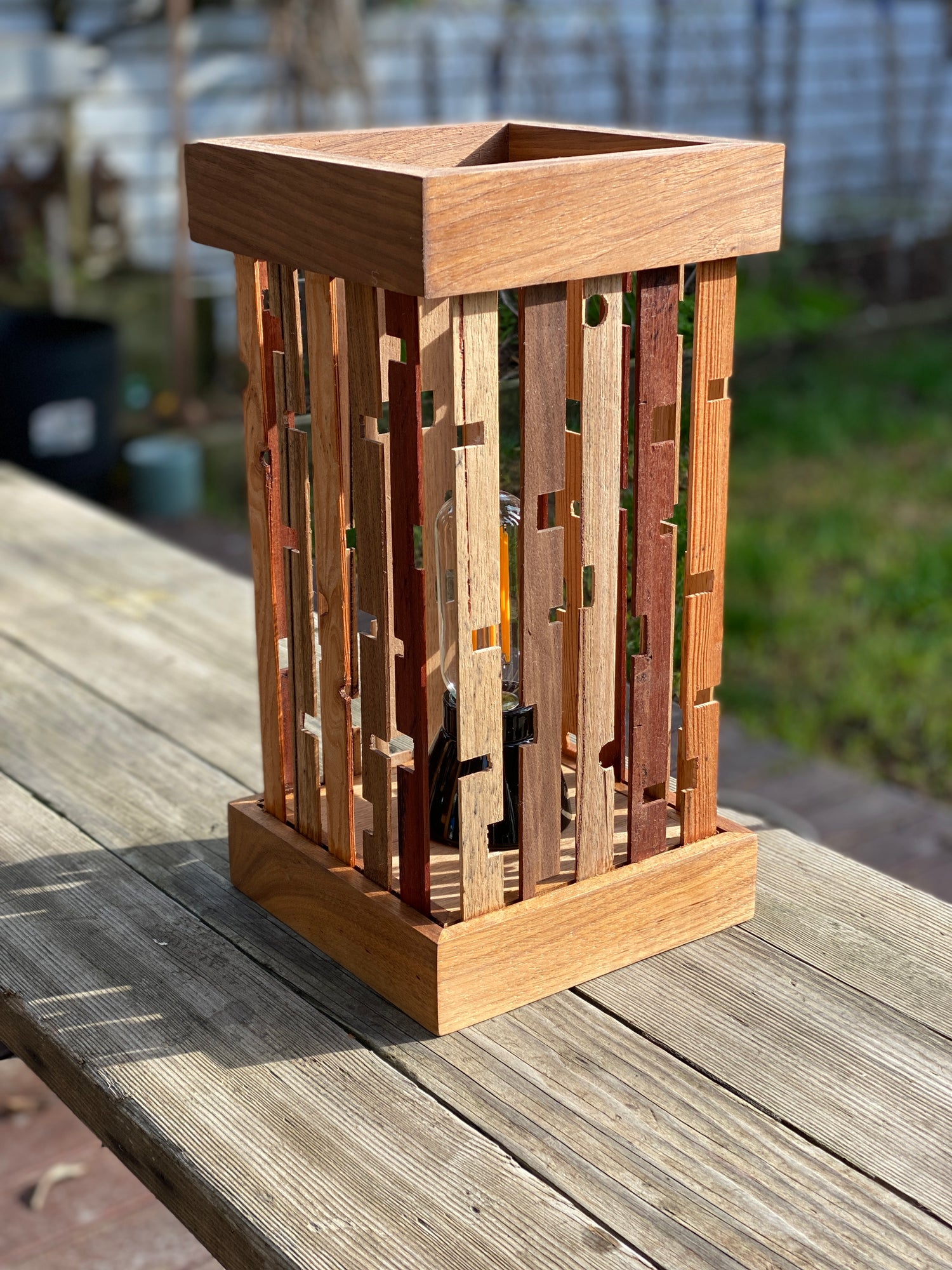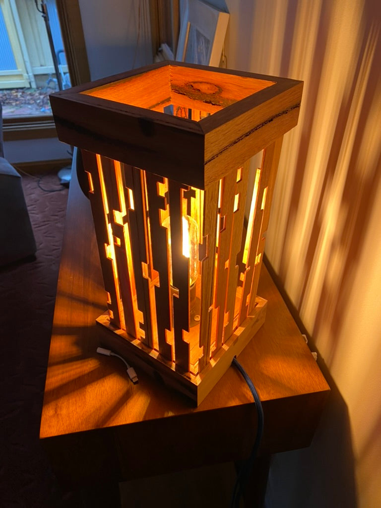 My shadow lamps are made to order and create a very special mood: they're painstakingly assembled from very slim pieces of contrasting coloured native timbers with unusual cutout shapes.