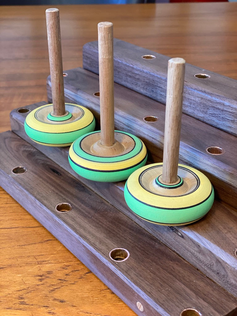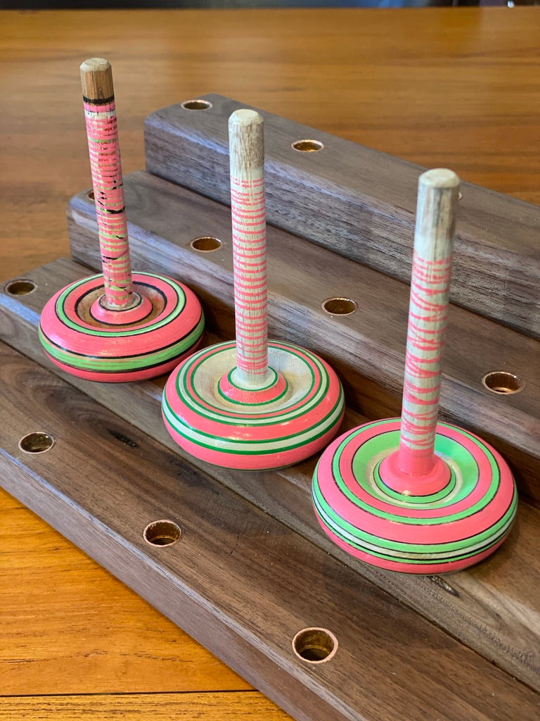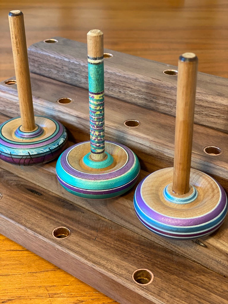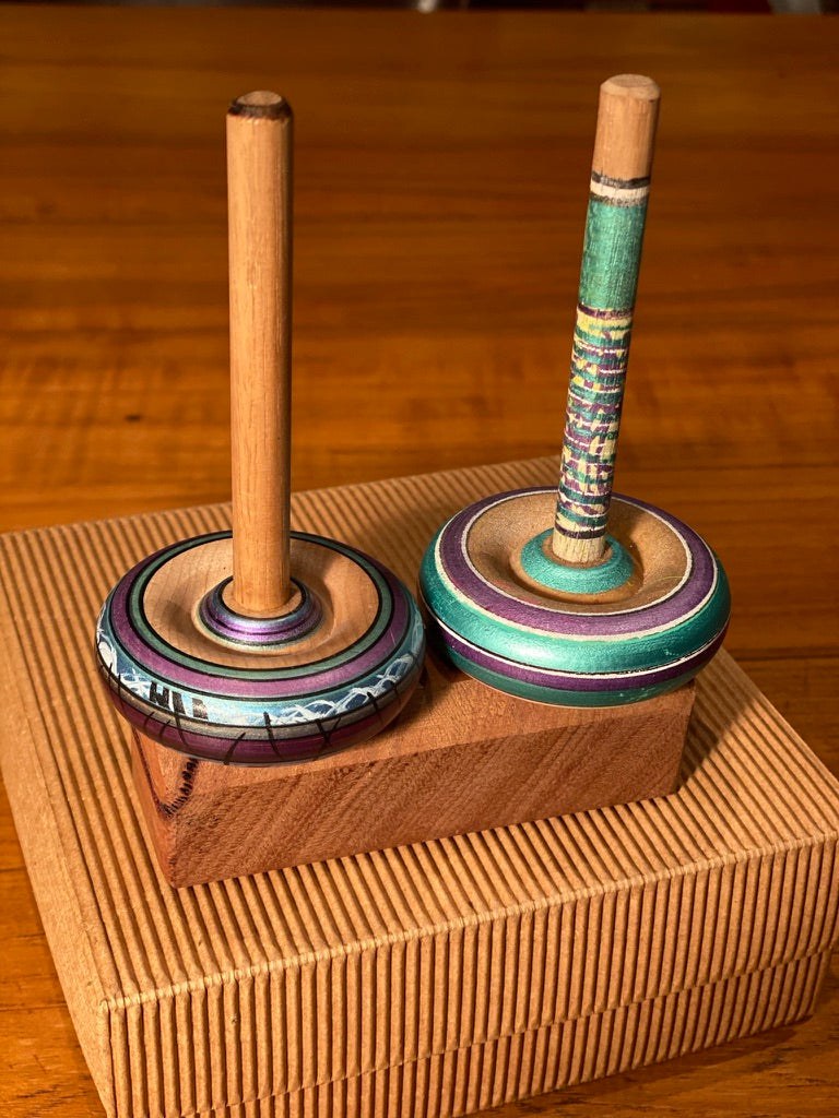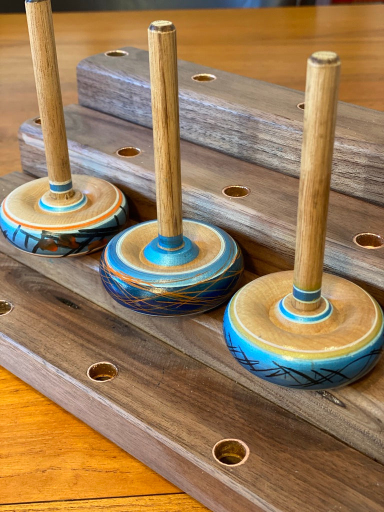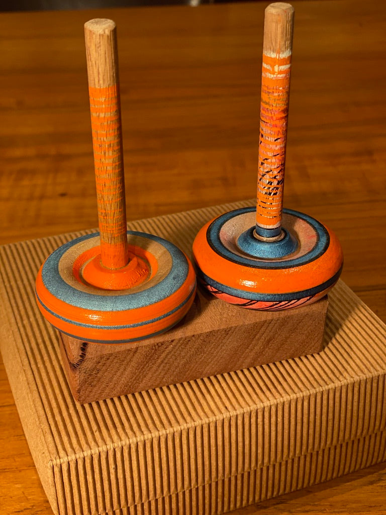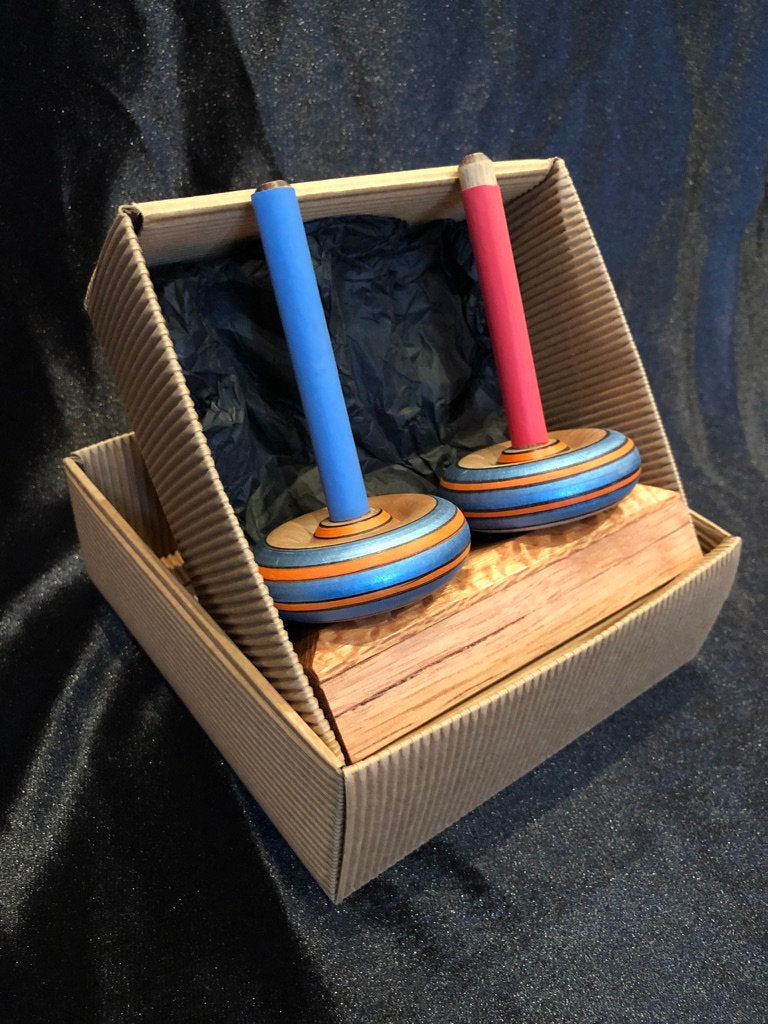Each large top set comes as a matched pair of two, with a custom-made display stand made from Victorian Alpine Ash with copper inserts. These are high performers, all tested to spin properly - they are sold in pairs ready to compete!
